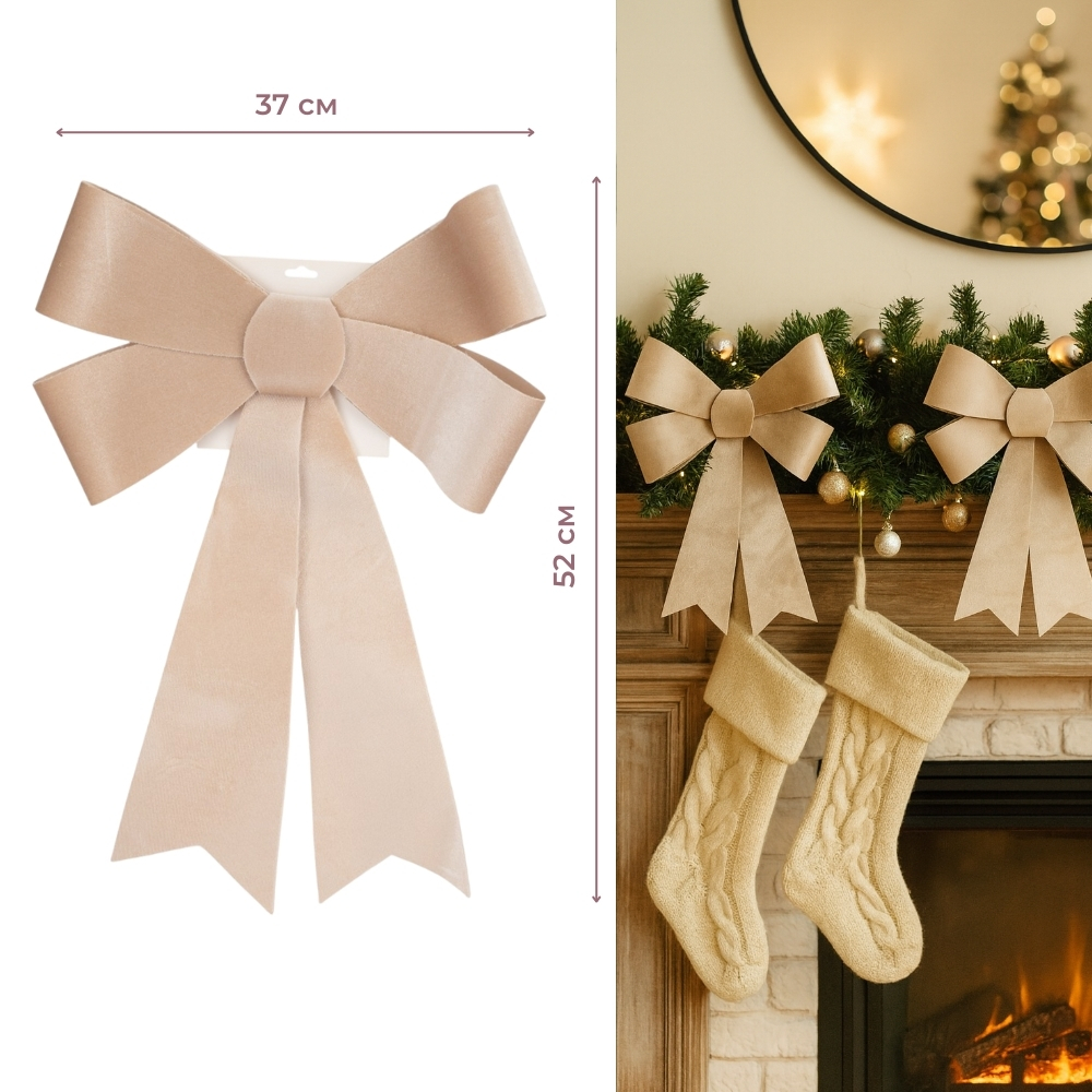 Новорічний бант — стильна прикраса, яка стане яскравим акцентом у святковому декорі, створюючи відчуття тепла й урочистості. Банти можна використовувати для прикрашання ялинки, дверей, вікон чи подарункових коробок — вони всюди виглядатимуть елегантно та святково.