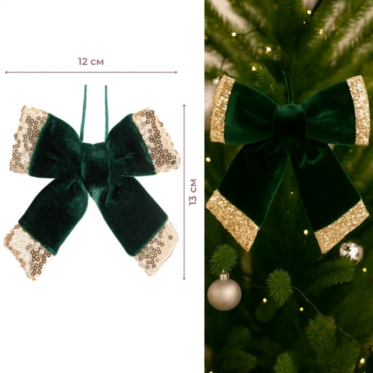 Вишуканий темно-зелений бант із ніжного оксамиту — ідеальний варіант для декору ялинки, святкового столу, каміна або подарункової упаковки. Матеріал приємний на дотик, а глибокий зелений колір гармонійно поєднується з гірляндами, іграшками та класичними різдвяними кольорами.