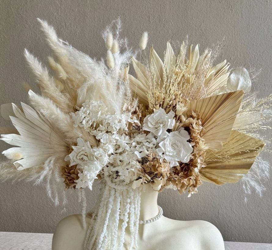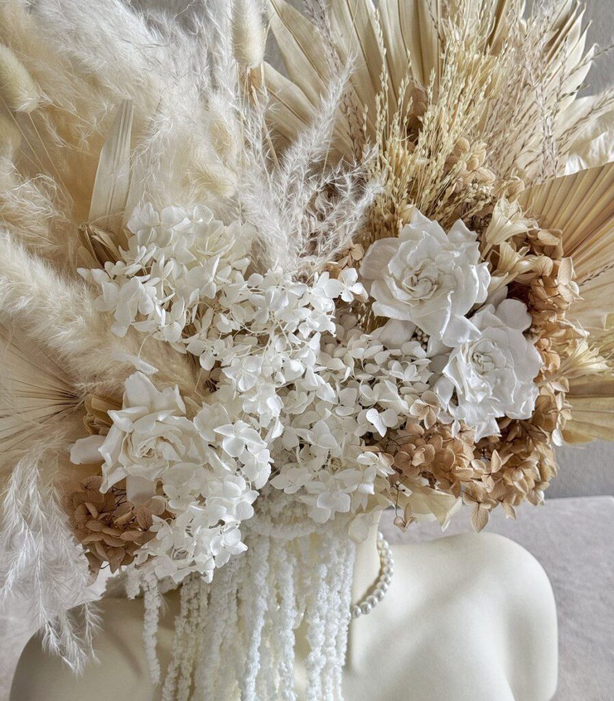 Вишукана композиція у світлих, природних тонах — ідеальне рішення для створення затишної атмосфери. Поєднання ніжних відтінків білого, кремового, бежевого і натуральна текстура сухоцвітів створюють ефект спокою та гармонії.