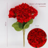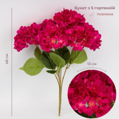 Висота – 48 см, діаметр бутону – 13 см. В букеті 5 бутонів. Квіти виконані з тканини, стебла – з пластику. Штучний букет гортензій з об’ємними суцвіттями виглядає природно та витончено. Декоративне листя додає композиції натуральності, роблячи її ідеальним вибором для інтер’єру або святкового оформлення. Завдяки якісним матеріалам квіти не втрачають форму та вигляд, не потребуючи догляду.