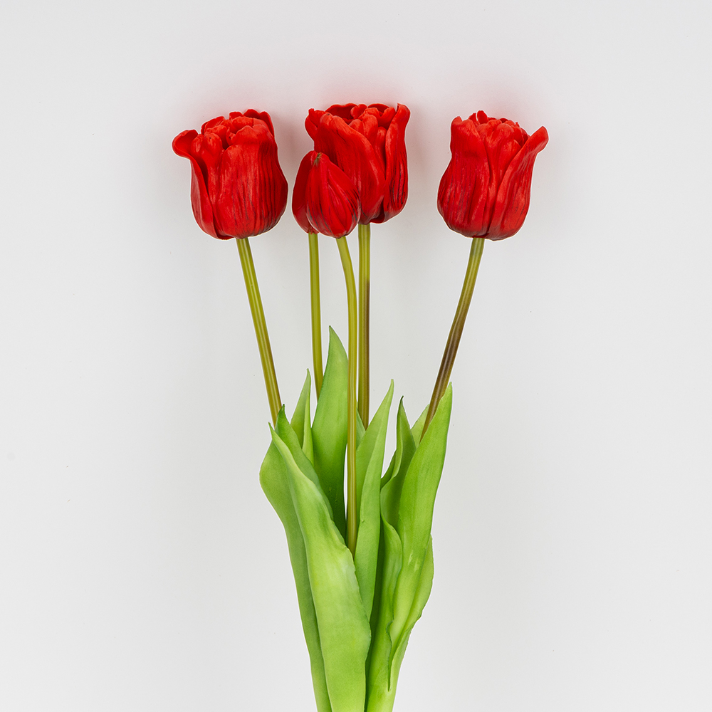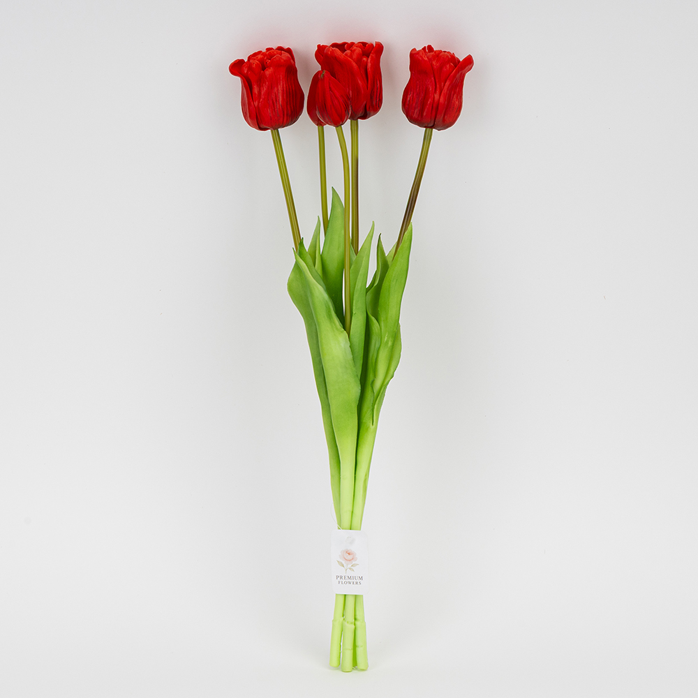Букет з 5 тюльпанів. Висота букету — 49 см, діаметр бутону — 5 см. Виготовлений з латексу. Букет тюльпанів з латексу — витончена композиція, що вражає своєю неповторною красою та реалістичністю, відтворюючи живі квіти з великою деталізацією. Такий букет є ідеальним варіантом для створення декоративних композицій, декорування святкових заходів, фотостудій, вітрин магазинів, кафе тощо! Букет залишиться свіжим та привабливим протягом тривалого часу без надмірного догляду.