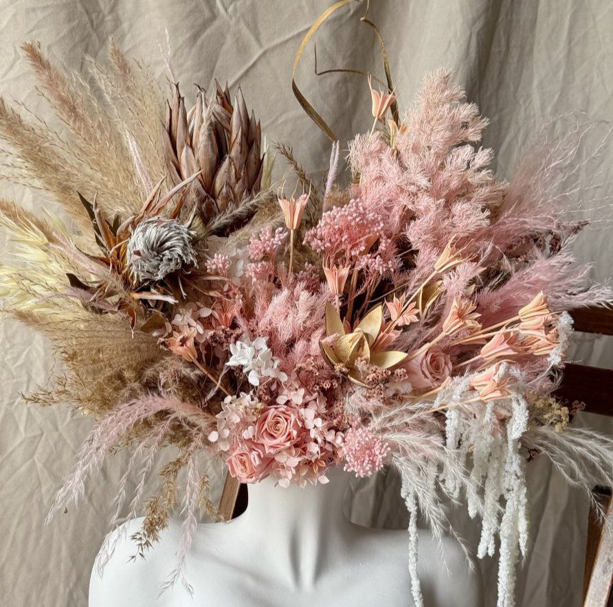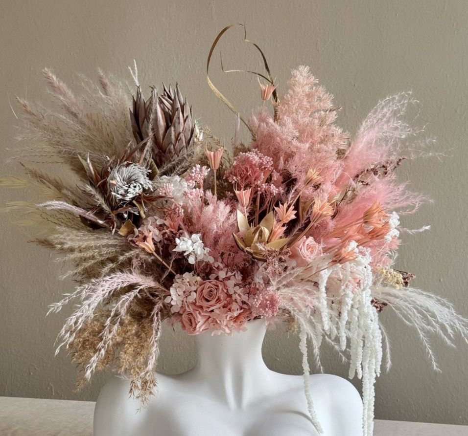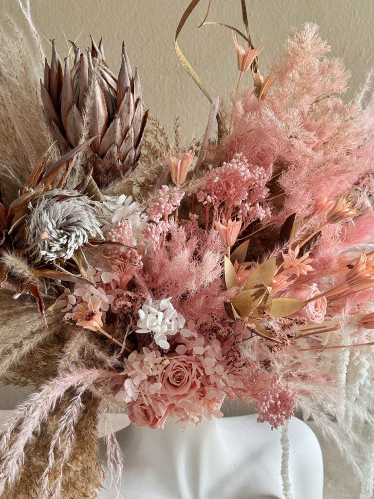Поєднання сухоцвітів і стабілізованих квітів створює атмосферу затишку і гармонії.