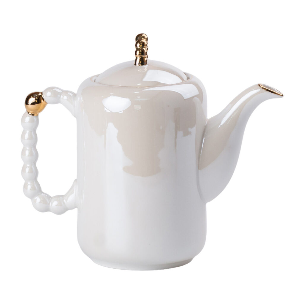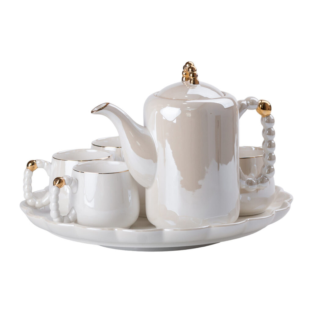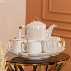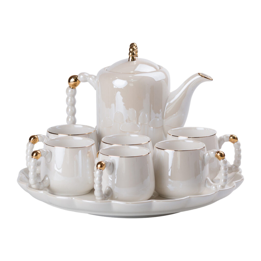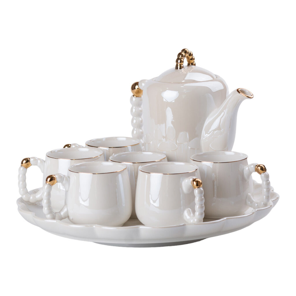 Чайний сервіз порцелянаовий на 6 персон – це вишуканий набір із 8 предметів, що ідеально підходить для стильного чаювання. Виготовлений з якісного порцелянау, сервіз має гладку глазуровану поверхню, що надає йому блискучий і елегантний вигляд. Унікальні ручки чашок і чайника виконані у формі перлин, додаючи витонченого шарму і розкоші. Чашки прикрашені золотим обідком, який підкреслює вишуканість дизайну. У комплект також входить таця, що робить цей набір зручним і практичним для сервірування. Характеристики: Матеріал: порцеляна Кількість персон: 6 Кількість предметів: 8 (чайник, 6 чашок, таця) Поверхня: Глазурована Ручки: У вигляді перлин Переваги сервізу: Вишуканий дизайн: Перлинні ручки та золоті обідки надають набору унікальний і розкішний вигляд. Якість матеріалів: Виготовлений із високоякісного порцелянау з глазурованою поверхнею для довговічності та естетики. Зручність сервірування: Включає тацю для комфортного подавання чаю та закусок. Універсальність: Ідеальний як для повсякденного використання, так і для святкових заходів.