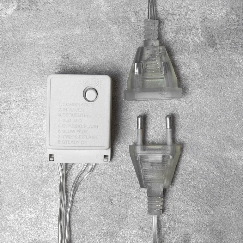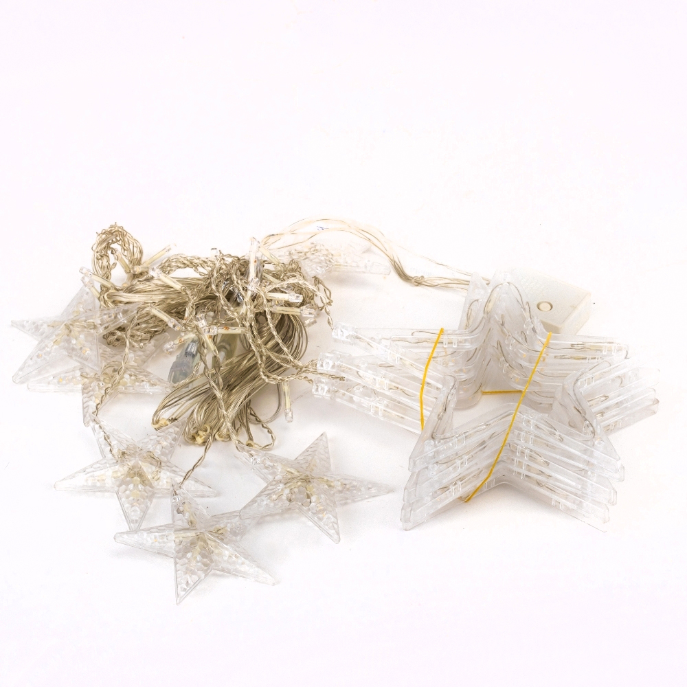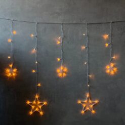Кількість світлодіодів: 140 LED. Колір LED: жовтий. Тип живлення: електромережа. Живлення: 220 V. Кількисть режимів: 8. Слаботочний адаптер з кнопкою управління. Гірлянда обладнана спеціальним роз’ємом, який дозволяє з’єднувати кілька гірлянд між собою в один ланцюг. Гірлянда має вилку для підключення до джерела живлення (електромережі) — через неї перша гірлянда отримує електрику та з’єднувальну вилку (роз’єм) на іншому кінці гірлянди — через неї можна підключити наступну гірлянду. Це дозволяє створити довший ланцюг гірлянд, з’єднавши кілька наборів без додаткових розеток. Гірлянда складається з вертикальних ниток з мерехтливими LED-лампочками, на яких закріплені фігурки у вигляді зірок різного розміру: 18*18 та 9*9 см, які звисають донизу на 90 і 55 см через раз та розташовані 25 см один від одного. Кожна зірка світиться теплим світлом, створюючи відчуття зимового чуда та затишку. Гірлянда нагадує світлову штору, яка ідеально підходить для прикраси вікон, дверних прорізів, стін або будь-яких інших площин.