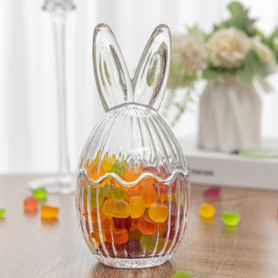 Ця стильна ємність у вигляді кролика, виготовлена з високоякісного скла, стане оригінальною прикрасою вашого інтер’єру. Її витончений дизайн і компактні розміри роблять її універсальною для використання у різних цілях. Ємність ідеально підходить для зберігання цукерок, горіхів, дрібних аксесуарів чи навіть сувенірів. Прозоре скло додає легкості, а чарівна форма кролика приносить нотки затишку та радості. Цей стильний аксесуар стане не лише функціональним елементом, а й чудовим символом щастя, удачі та добробуту у вашому домі.