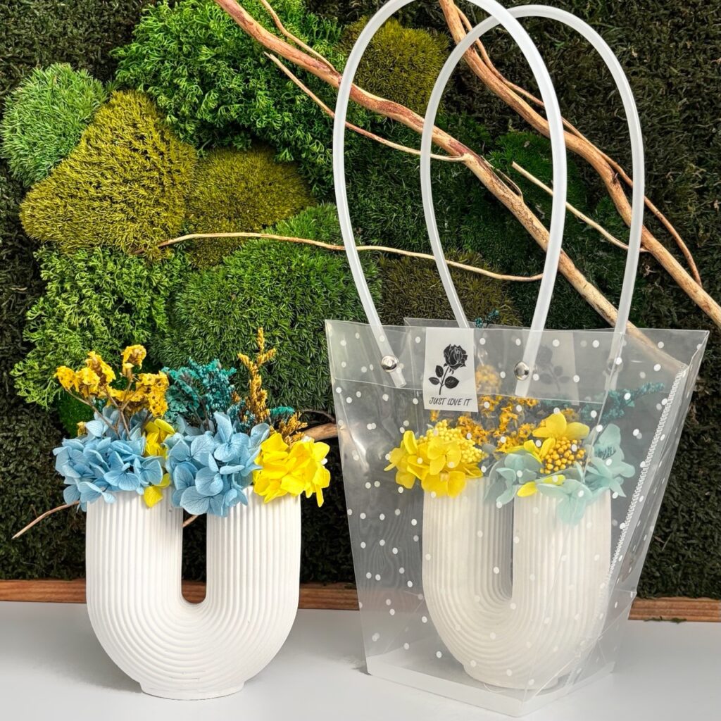 Флораріум “Символ свободи” – це справжній витвір мистецтва, який поєднує в собі красу природи й любов до рідної країни. Ця композиція зі стабілізованими квітами створює неперевершену атмосферу затишку та гармонії у вашому домі чи офісі. Завдяки використанню стабілізованих рослин, флораріум зберігає свіжість і яскравість без потреби у догляді.