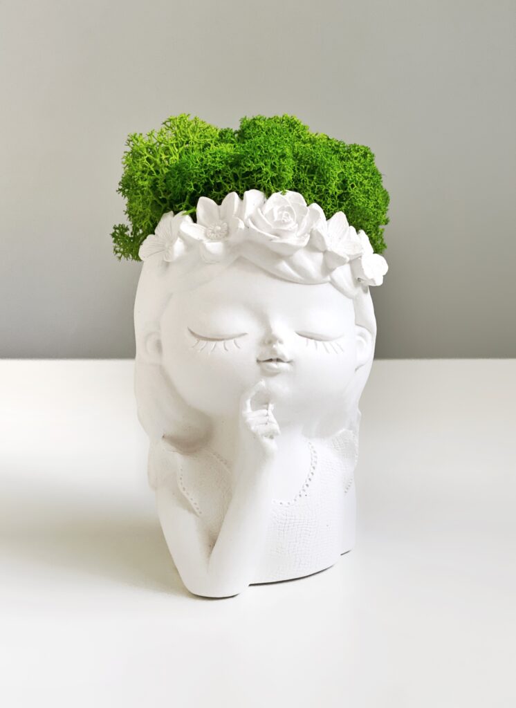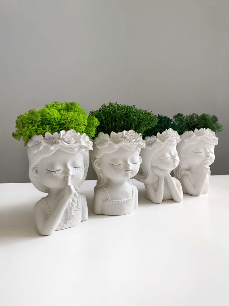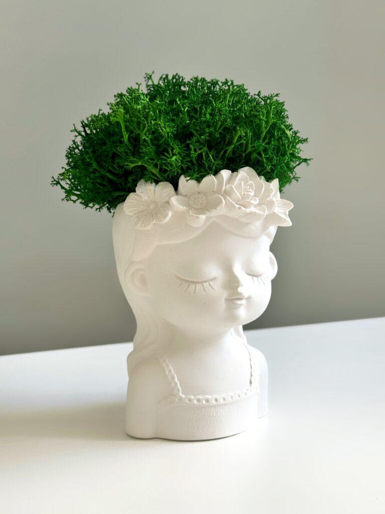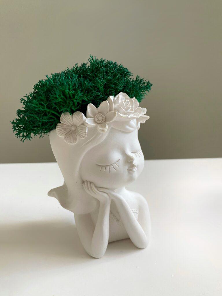 Елегантне кашпо «Дівчина з віночком» з різними відтінками зеленого стабілізованого моху — це витвір мистецтва, що стане яскравим акцентом у будь-якому інтер’єрі. Виготовлене з гіпсу, воно поєднує витонченість скульптури та живу зелень стабілізованого моху, який не потребує догляду, поливу чи сонячного світла. Ви можете обрати бажаний вигляд кашпо (A, B, C, D) та колір моху (1–4), вказавши номер у коментарі до замовлення. Ідеально підходить для дому, офісу або креативного подарунку.