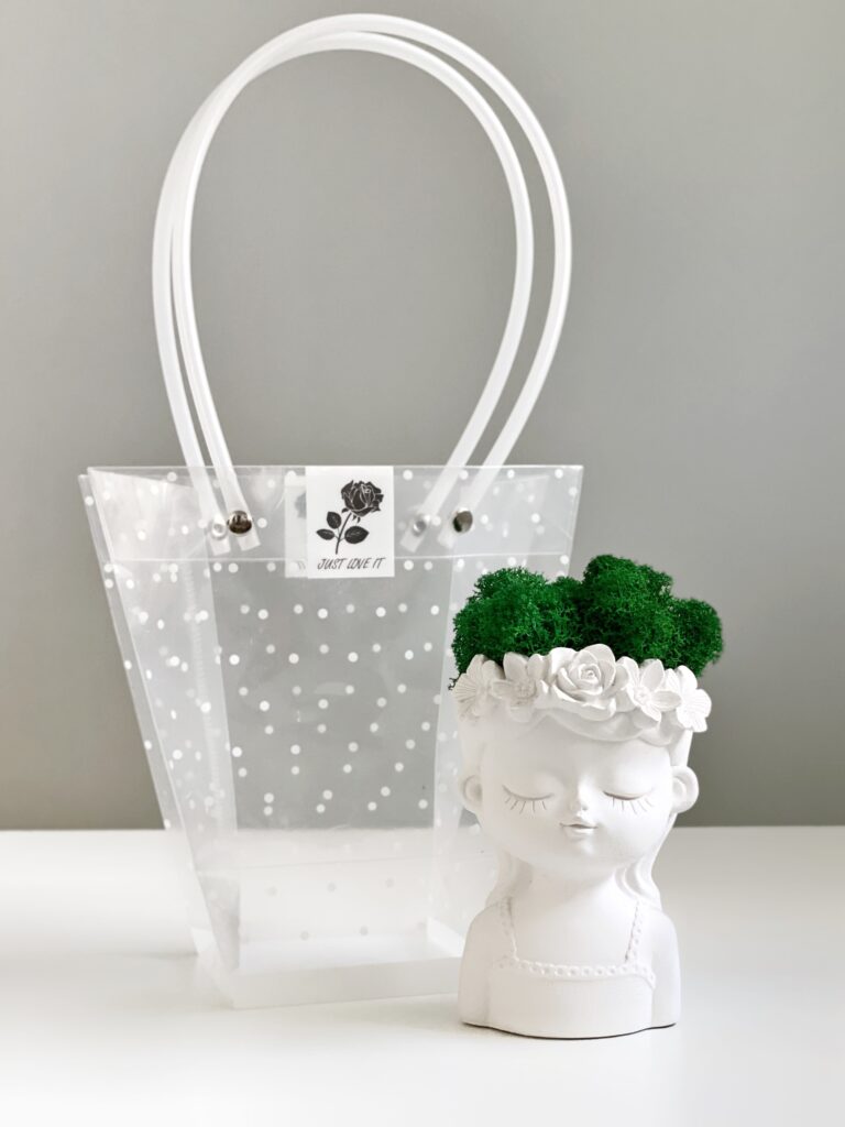 Гарне, акуратне кашпо, пухнастий яскравий мох. Зручно, що є упаковка-сумочка.