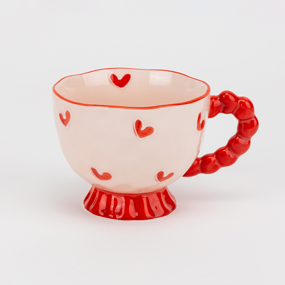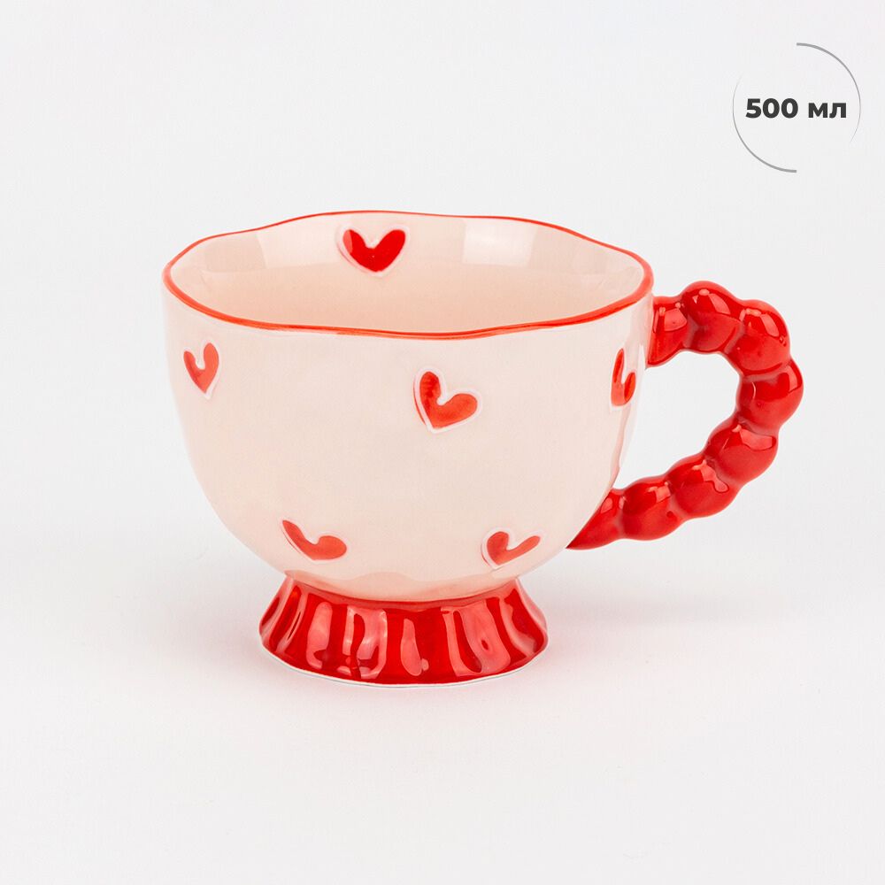 Об’єм — 500 мл. Ця керамічна кружка створена для особливих моментів, поєднуючи в собі авторський лаконізм та ніжність. Світла чаша, прикрашена розсипом червоних сердець, гармонійно доповнена насиченою червоною ручкою у формі об’ємних намистин. Витончений червоний кант по хвилястому краю та рельєфна ніжка-підставка додають виробу завершеності та особливого шарму, роблячи його ідеальним подарунком для близьких.