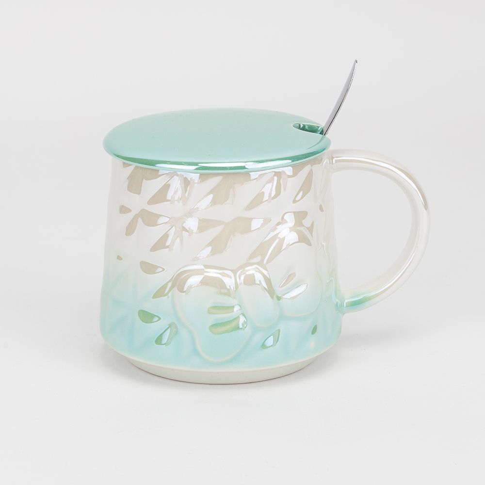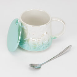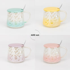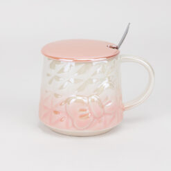 Об’єм — 400 мл. Ця елегантна керамічна кружка зачаровує своїм м’яким перламутровим сяйвом та об’ємним рельєфним декором у вигляді банта. Особливістю моделі є повна комплектація для комфортного чаювання: щільна керамічна кришка допомагає довше зберігати напій гарячим, а спеціальний отвір у ній передбачений для витонченої металевої ложечки, що йде у наборі. Кружка має зручну округлу ручку та стійку форму, що робить її не лише красивим аксесуаром, а й практичним вибором для щоденного використання. Такий набір стане чудовим подарунком для тих, хто любить естетику в деталях, і додасть нотку розкоші будь-якій кавовій паузі.