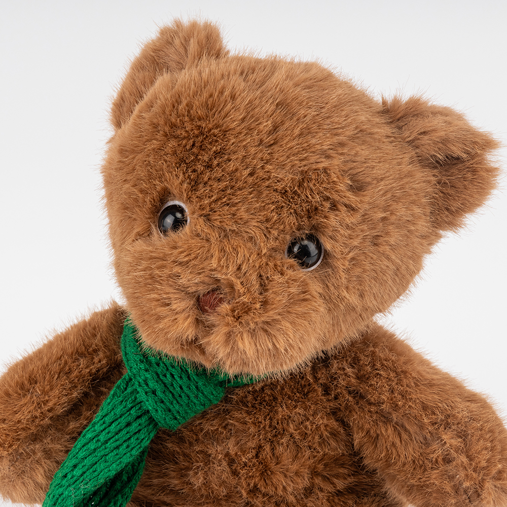 Пухнастий ведмедик у яскравому святковому вбранні — справжнє втілення затишку та тепла! М’яке плюшеве хутро приємне на дотик, а зелений шарфик додає іграшці новорічного настрою. Ідеально підходить як подарунок дітям і дорослим або як миле доповнення до святкового декору.