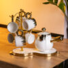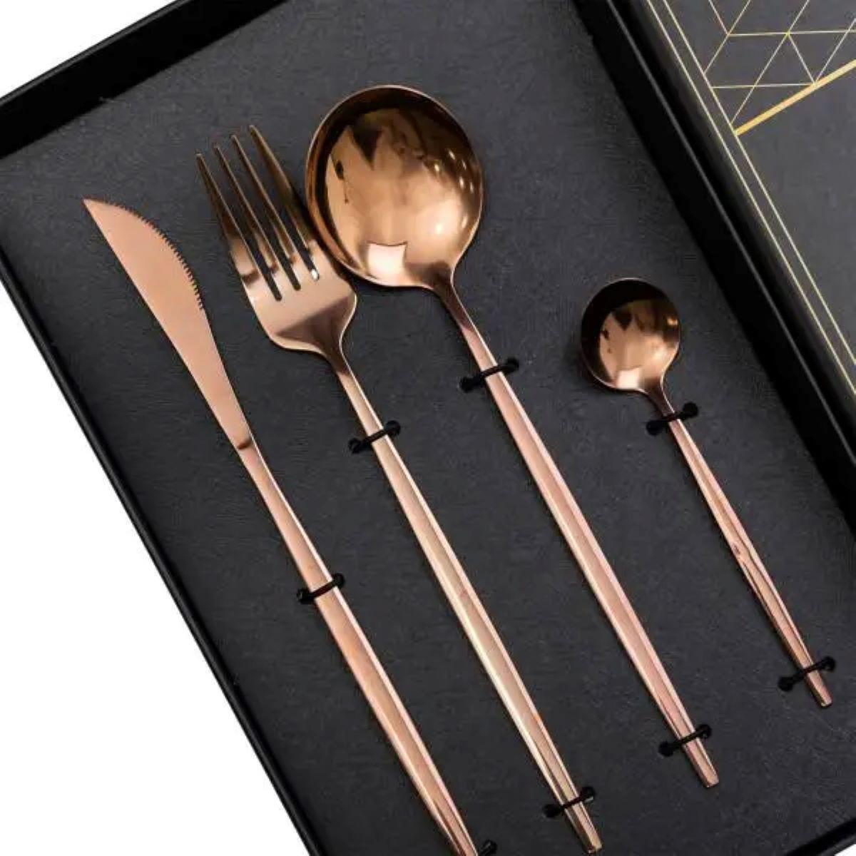 Набір столових приборів містить 24 предмети, призначені для обслуговування 6 персон. До комплекту входять 6 столових ложок, 6 чайних ложок, 6 виделок і 6 столових ножів. Основна частина приладів має золотистий відтінок, а ручки виконані в чорному кольорі, що створює контрастний і стриманий вигляд. Основні характеристики: Кількість предметів у наборі: 24 шт; Кількість персон: 6; Матеріал: нержавіюча сталь; Упаковка: коробка; Розміри приладів: довжина столового ножа: 22.5 см; довжина столової ложки: 20.8 см; довжина столової виделки: 21.5 см; довжина чайної ложки: 12.8 см. Комплектація набору: столовий ніж: 6 шт; столова ложка: 6 шт; столова виделка: 6 шт; чайна ложка: 6 шт. Матеріалом виготовлення є нержавіюча сталь, яка забезпечує стійкість до корозії та механічних пошкоджень. Поверхня гладенька, що полегшує очищення та догляд. Чорні ручки мають ергономічну форму, що сприяє зручному захопленню та комфортному використанню. Комплект підходить як для щоденного застосування, так і для сервірування святкового столу. Завдяки поєднанню золотистої сталі з чорними ручками, прилади гармонійно вписуються в сучасний інтер’єр кухні та можуть комбінуватися з різними видами посуду.