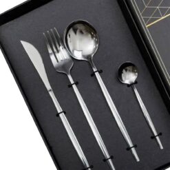 Набір столових приборів містить 24 предмети, призначені для обслуговування 6 персон. До комплекту входять 6 столових ложок, 6 чайних ложок, 6 виделок і 6 столових ножів. Основна частина приладів має золотистий відтінок, а ручки виконані в чорному кольорі, що створює контрастний і стриманий вигляд. Основні характеристики: Кількість предметів у наборі: 24 шт; Кількість персон: 6; Матеріал: нержавіюча сталь; Упаковка: коробка; Розміри приладів: довжина столового ножа: 22.5 см; довжина столової ложки: 20.8 см; довжина столової виделки: 21.5 см; довжина чайної ложки: 12.8 см. Комплектація набору: столовий ніж: 6 шт; столова ложка: 6 шт; столова виделка: 6 шт; чайна ложка: 6 шт. Матеріалом виготовлення є нержавіюча сталь, яка забезпечує стійкість до корозії та механічних пошкоджень. Поверхня гладенька, що полегшує очищення та догляд. Чорні ручки мають ергономічну форму, що сприяє зручному захопленню та комфортному використанню. Комплект підходить як для щоденного застосування, так і для сервірування святкового столу. Завдяки поєднанню золотистої сталі з чорними ручками, прилади гармонійно вписуються в сучасний інтер’єр кухні та можуть комбінуватися з різними видами посуду.