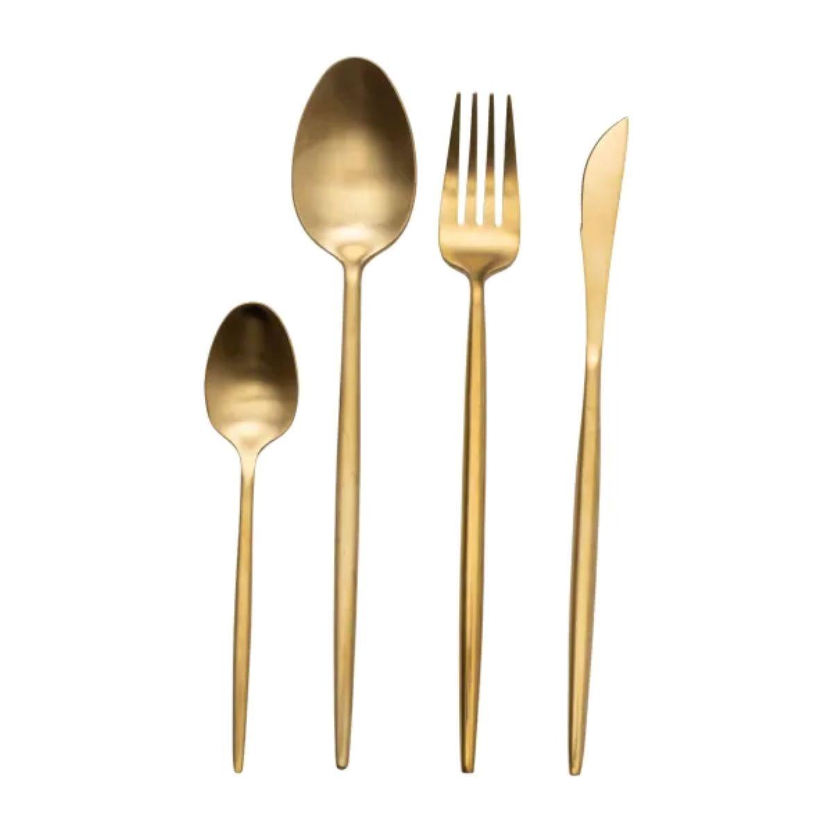 Набір столових приборів золотистого кольору складається з 24 предметів: 6 столових ложок, 6 чайних ложок, 6 виделок і 6 столових ножів. Кожен предмет має класичний дизайн без зайвих декоративних елементів, що робить їх універсальними для щоденного використання або сервірування святкового столу. Столові прибори мають гладку поліровану поверхню, яка легко очищається і не затримує забруднення. Основні характеристики: Кількість предметів у наборі: 24 шт; Кількість персон: 6; Матеріал: нержавіюча сталь; Упаковка: коробка; Розміри приладів: довжина столового ножа: 21.5 см; довжина столової ложки: 22.5 см; довжина столової виделки: 22 см; довжина чайної ложки: 14.5 см. Комплектація набору: столовий ніж: 6 шт; столова ложка: 6 шт; столова виделка: 6 шт; чайна ложка: 6 шт. Матеріал виготовлення – нержавіюча сталь, яка вирізняється міцністю, стійкістю до корозії та довговічністю. Леза ножів мають заточену кромку, що забезпечує зручне нарізування продуктів. Вилки та ложки мають ергономічну форму, що сприяє комфортному утриманню в руці під час прийому їжі. Усі предмети набору можна мити в посудомийній машині без ризику втрати блиску або пошкодження поверхні. Комплект поставляється в базовій упаковці, яка захищає прилади від механічних пошкоджень під час транспортування. Набір підходить для використання в домашніх умовах, закладах громадського харчування або як варіант для тимчасового житла. Завдяки стандартним розмірам і нейтральному дизайну ці столові прибори легко поєднуються з різними стилями посуду та текстилю для сервірування столу.