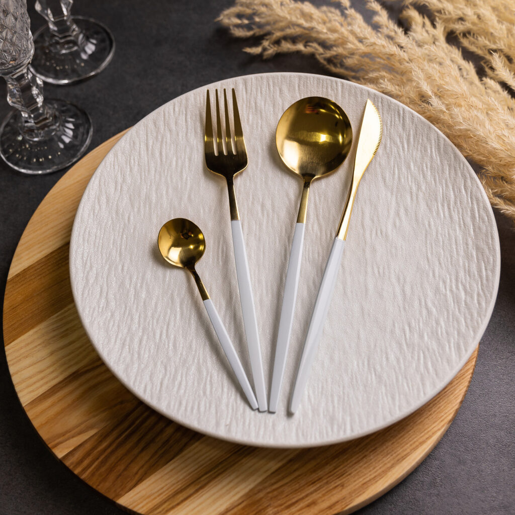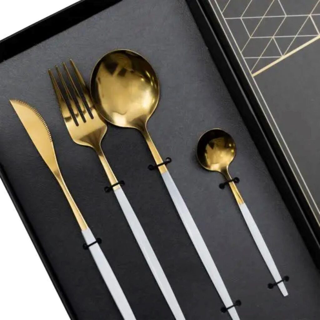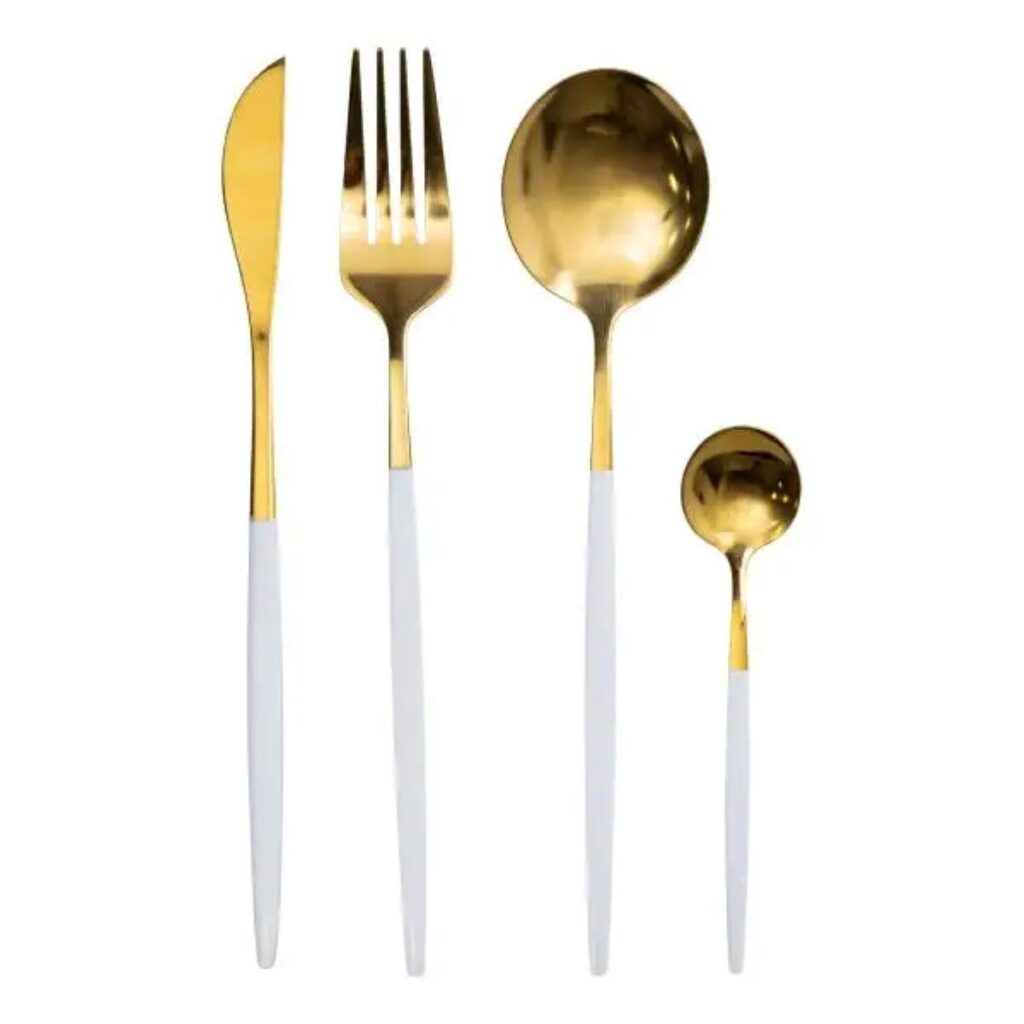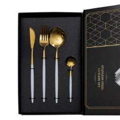 Набір столових приборів містить 24 предмети, призначені для обслуговування 6 персон. До комплекту входять 6 столових ложок, 6 чайних ложок, 6 виделок і 6 столових ножів. Основна частина приладів має золотистий відтінок, а ручки виконані в білому кольорі, що створює контрастний і стриманий вигляд. Основні характеристики: Кількість предметів у наборі: 24 шт; Кількість персон: 6; Матеріал: нержавіюча сталь; Упаковка: коробка; Розміри приладів: довжина столового ножа: 22.5 см; довжина столової ложки: 20.8 см; довжина столової виделки: 21.5 см; довжина чайної ложки: 12.8 см. Комплектація набору: столовий ніж: 6 шт; столова ложка: 6 шт; столова виделка: 6 шт; чайна ложка: 6 шт. Матеріалом виготовлення є нержавіюча сталь, яка забезпечує стійкість до корозії та механічних пошкоджень. Поверхня гладенька, що полегшує очищення та догляд. Білі ручки мають ергономічну форму, що сприяє зручному захопленню та комфортному використанню. Комплект підходить як для щоденного застосування, так і для сервірування святкового столу. Завдяки поєднанню золотистої сталі з білими ручками, прилади гармонійно вписуються в сучасний інтер’єр кухні та можуть комбінуватися з різними видами посуду.