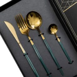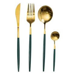 Набір столових приборів містить 24 предмети, призначені для обслуговування 6 персон. До комплекту входять 6 столових ложок, 6 чайних ложок, 6 виделок і 6 столових ножів. Основна частина приладів має золотистий відтінок, а ручки виконані в зеленому кольорі, що створює контрастний і стриманий вигляд. Основні характеристики: Кількість предметів у наборі: 24 шт; Кількість персон: 6; Матеріал: нержавіюча сталь; Упаковка: коробка; Розміри приладів: довжина столового ножа: 22.5 см; довжина столової ложки: 20.8 см; довжина столової виделки: 21.5 см; довжина чайної ложки: 12.8 см. Комплектація набору: столовий ніж: 6 шт; столова ложка: 6 шт; столова виделка: 6 шт; чайна ложка: 6 шт. Матеріалом виготовлення є нержавіюча сталь, яка забезпечує стійкість до корозії та механічних пошкоджень. Поверхня гладенька, що полегшує очищення та догляд. Зелені ручки мають ергономічну форму, що сприяє зручному захопленню та комфортному використанню. Комплект підходить як для щоденного застосування, так і для сервірування святкового столу. Завдяки поєднанню золотистої сталі з зеленими ручками, прилади гармонійно вписуються в сучасний інтер’єр кухні та можуть комбінуватися з різними видами посуду.