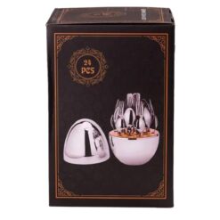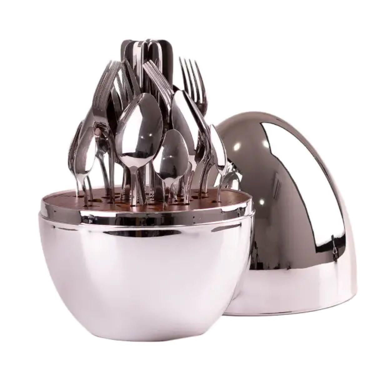 Набір столових приладів в оригінальному кейсі – це чудовий варіант як для святкового сервірування, так і для повсякденного використання. Набір розрахований на 6 персон і включає: 6 столових ножів, 6 їдальних ложок, 6 десертних ложок і 6 їдальних виделок. Прилади виготовлені з високоякісної нержавіючої сталі, мають лаконічний дизайн. Кейс відрізняється дзеркальною поверхнею та виготовлений з пластику. Набір столових приладів у формі яйця поєднує функціональність та естетику, роблячи сервірування столу зручнішим і красивішим. Основні характеристики набору столових приладів у яйці: Висота: 29 см Діаметр: 19.5 см Основні характеристики приладів: Довжина ножів: 22.5 см Довжина ложок: 20 см Довжина виделок: 20 см Довжина чайних ложок: 13.5 см Переваги набору столових приладів: Зручність: всі прилади завжди під рукою в акуратному порядку завдяки зручній підставці Функціональність: набір включає всі необхідні прилади для сервірування столу Естетика: стильний і сучасний вигляд, що прикрашає вашу кухню Якість: виготовлений з високоякісних матеріалів, які прослужать довгі роки