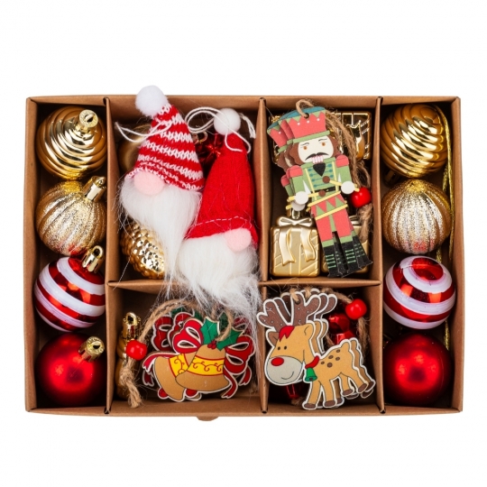 Розкішний набір ялинкових іграшок включає 32 різноманітних прикрас, виготовлених із пластику високої якості. Іграшки представлені у різних розмірах — від мініатюрних до виразних, що дозволяє створити та гармонійний декор на ялинці. До набору входять прикраси різної текстури та стилю. Іграшки різних розмірів дозволяють рівномірно заповнити ялинку, створюючи ефект багатошаровості та об’єму.
