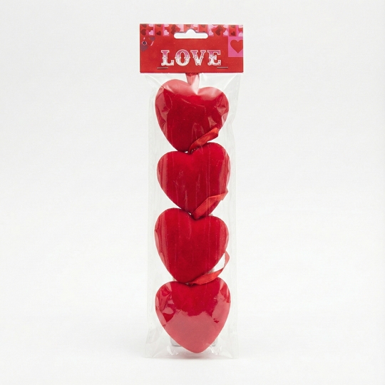 Висота серця — 6 см. В наборі 4 шт.Завдяки м’якій оксамитовій текстурі та компактному розміру 6 см, ці підвіски привертають увагу з першого погляду та легко інтегруються у будь-який дизайн. Використання таких флокових виробів дозволяє швидко та естетично підготувати простір до тематичних свят, додаючи йому особливого затишку та емоційного акценту.