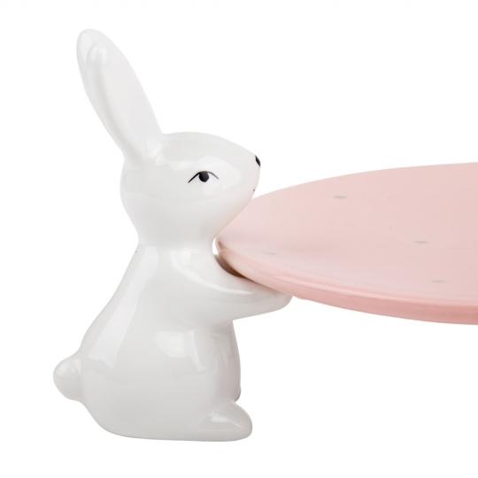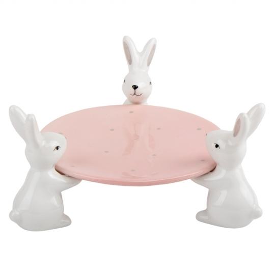 Керамічна підставка з кроликами – це не тільки чарівна родзинка в тематичному великодньому декорі, але і універсальна річ в повсякденному житті. Вона порадує будь-кого у вашому домі, кафе або фотостудії! Таку підставку можна використовувати для десертів, пасок, фруктів, а також для гарного зберігання різних аксесуарів, сувенірів, побутових дрібниць. Виготовлена з кераміки. Діаметр пісдтавки – 18 см, висота – 11,5 см.