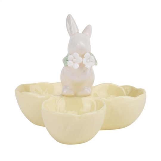 Ця елегантна підставка для 3 яєць виготовлена з якісної кераміки з глянцевим покриттям. Дизайн виконаний у вигляді квітки з м’якими вигнутими краями, створюючи витончений і святковий вигляд. У центрі розташована фігурка білого кролика, прикрашеного квітковим декором у пастельних тонах. Підставка ідеально підходить для сервірування крашанок, шоколадних яєць або невеликих десертів. Її стійка конструкція забезпечує зручне використання, а стильний зовнішній вигляд робить її чудовою прикрасою святкового столу.