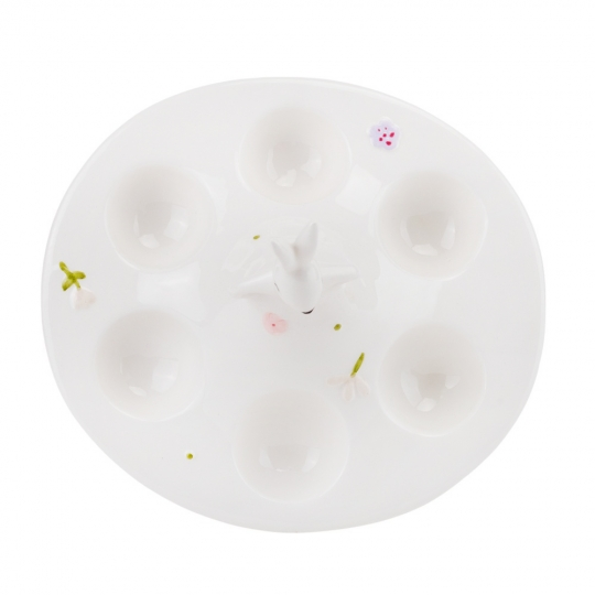 Ця витончена керамічна підставка призначена для зберігання 6 яєць, створюючи ефект стильного та святкового оформлення великоднього столу. У центрі композиції височіє милий кролик, виконаний у ніжному білому кольорі з декоративними квітковими елементами. Форма підставки забезпечує зручне розташування яєць та стійкість на поверхні. Такий виріб стане не лише практичним аксесуаром, а й елегантним елементом декору.