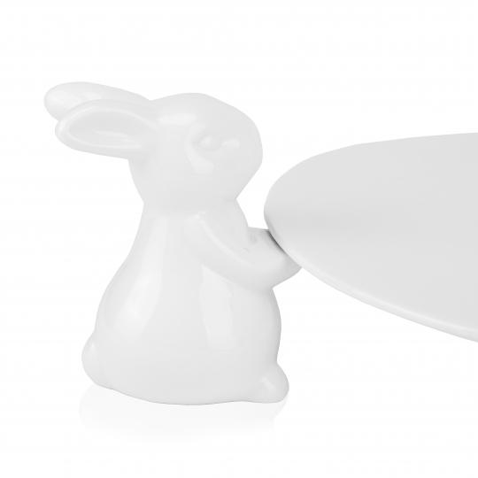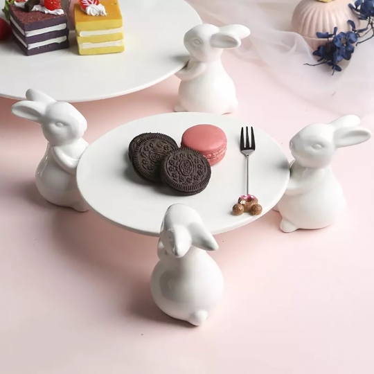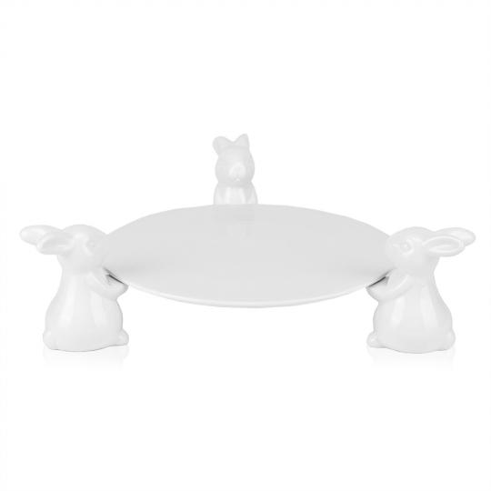 ВАЖЛИВО: підставка поставляється в розібраному вигляді, в наборі є клей, підставка та три фігурки кроликів, які необхідно приклеїти до стійки самостійно! Керамічна підставка з кроликами – це не тільки чарівна родзинка в тематичному великодньому декорі, але і універсальна річ в повсякденному житті. Вона порадує будь-кого у вашому домі, кафе або фотостудії! Таку підставку можна використовувати для десертів, пасок, фруктів, а також для гарного зберігання різних аксесуарів, сувенірів, побутових дрібниць. Виготовлена з кераміки. Діаметр пісдтавки – 25 см, висота – 10 см.