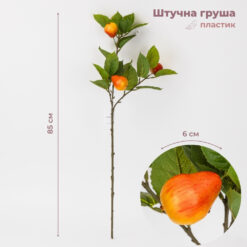 Висота – 65 см. Діаметр найбільшої груші – 6 см, найменшої – 5 см. Штучна гілка «Груша» — декоративний елемент із реалістично відтвореними плодами, що надає композиціям природного та затишного вигляду. Акуратно опрацьовані фрукти з характерною формою та фактурою виглядають максимально наближено до справжніх і створюють ефект гілки з дозрілими плодами. Така гілка чудово підходить для оформлення інтер’єру, декоративних ваз, фотозон, вітрин магазинів, кафе та сезонного декору. Вона не потребує догляду, не втрачає привабливості з часом і дозволяє легко додати простору природних акцентів та теплого настрою.