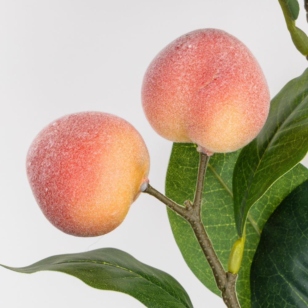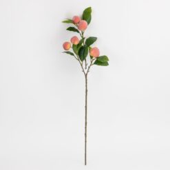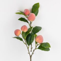 Висота – 70 см. Діаметр найбільшого персика – 5 см, найменшого – 4 см. Штучна гілка «Персик» — декоративний елемент із реалістично відтвореними плодами, що надає композиціям природного та затишного вигляду. Акуратно опрацьовані фрукти з характерною формою та фактурою виглядають максимально наближено до справжніх і створюють ефект гілки з дозрілими плодами. Така гілка чудово підходить для оформлення інтер’єру, декоративних ваз, фотозон, вітрин магазинів, кафе та сезонного декору. Вона не потребує догляду, не втрачає привабливості з часом і дозволяє легко додати простору природних акцентів та теплого настрою.