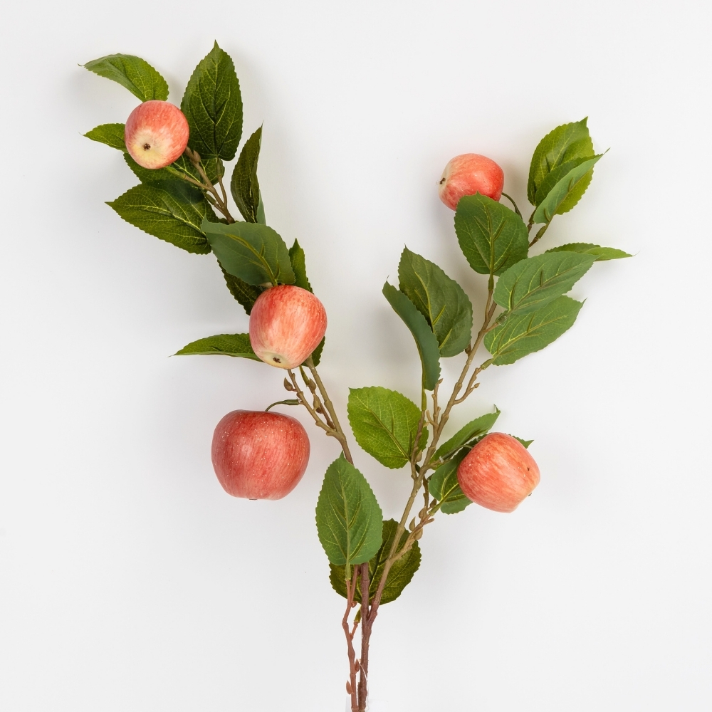 Висота – 85 см. Діаметр найбільшого яблучка – 7 см, найменшого – 4 см. Штучна гілка «Яблуня» — декоративний елемент із реалістично відтвореними плодами, що надає композиціям природного та затишного вигляду. Акуратно опрацьовані фрукти з характерною формою та фактурою виглядають максимально наближено до справжніх і створюють ефект гілки з дозрілими плодами. Така гілка чудово підходить для оформлення інтер’єру, декоративних ваз, фотозон, вітрин магазинів, кафе та сезонного декору. Вона не потребує догляду, не втрачає привабливості з часом і дозволяє легко додати простору природних акцентів та теплого настрою.