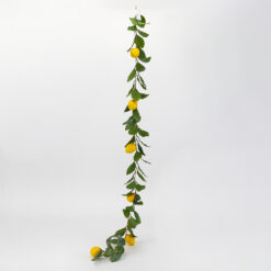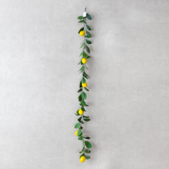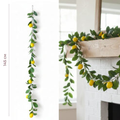 Довжина – 145 см. Ця декоративна гірлянда вражає своєю довжиною та густотою, створюючи ефект вертикального або ж горизонтального озеленення у вишуканому середземноморському стилі. Гірлянда щедро прикрашена яскраво–жовтими лимонами, що контрастують із насиченим темно–зеленим листям. Завдяки гнучкій основі, її легко використовувати для оформлення дверних отворів, дзеркал, фотозон або як центральний елемент сервірування столу. Гірлянда наповнить приміщення атмосферою сонячної Італії та свіжості, залишаючись яскравою без жодного догляду.