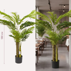Висота – 130 см. Штучне пальмове дерево в горщику висотою 130 см — ефектний інтер’єрний акцент для бізнесу, який миттєво створює атмосферу тропічного затишку та преміального комфорту без витрат на професійний догляд. Пишне реалістичне листя з деталізованою текстурою формує виразний об’єм та стає ідеальним візуальним фокусом у просторих залах, лаунж-зонах або біля вхідних груп. Пальма є універсальним рішенням для HoReCa, аквапарків, фітнес-центрів, фотостудій та великих офісів, де важливо підкреслити масштаб і статусність об’єкта. Дерево встановлене у базовий горщик, що дозволяє легко змінити його зовнішній вигляд, обравши дизайнерське кашпо під стиль вашого інтер’єру. Це практичне та довговічне рішення для комерційних проєктів, яке зберігає насичений зелений колір і презентабельний вигляд протягом багатьох років.