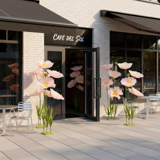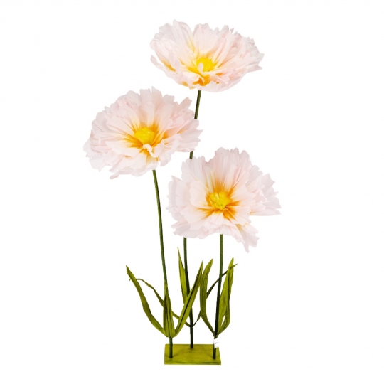 Висота – 165 см, діаметр бутона – 60 см. Розмір підставки – 30 см * 17 см. Ростові декоративні квіти ідеальні для професійного декорування вітрин, фотозон та івент-майданчиків. Конструкція розроблена для багаторазового використання: стебло є стійким, а підставка виконана з міцного ПВХ, гарантуючи надійну фіксацію. Пелюстки з ніжного гофрованого паперу є гнучкими, дозволяючи швидко змінювати їх форму під час монтажу. Весь комплект доставляється у розібраному вигляді, що суттєво оптимізує логістику та значно спрощує зберігання між проєктами. Цей декор є вигідним рішенням для швидкого та ефектного оформлення просторів.