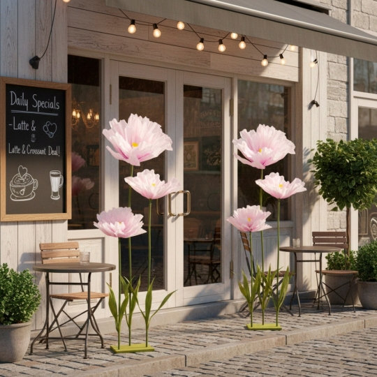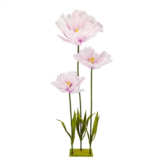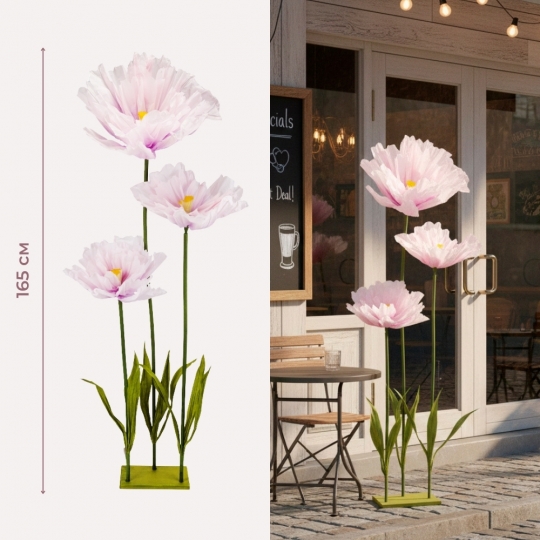Висота – 165 см, діаметр бутона – 60 см. Розмір підставки – 30 см * 17 см. Ростові декоративні квіти ідеальні для професійного декорування вітрин, фотозон та івент-майданчиків. Конструкція розроблена для багаторазового використання: стебло є стійким, а підставка виконана з міцного ПВХ, гарантуючи надійну фіксацію. Пелюстки з ніжного гофрованого паперу є гнучкими, дозволяючи швидко змінювати їх форму під час монтажу. Весь комплект доставляється у розібраному вигляді, що суттєво оптимізує логістику та значно спрощує зберігання між проєктами. Цей декор є вигідним рішенням для швидкого та ефектного оформлення просторів.