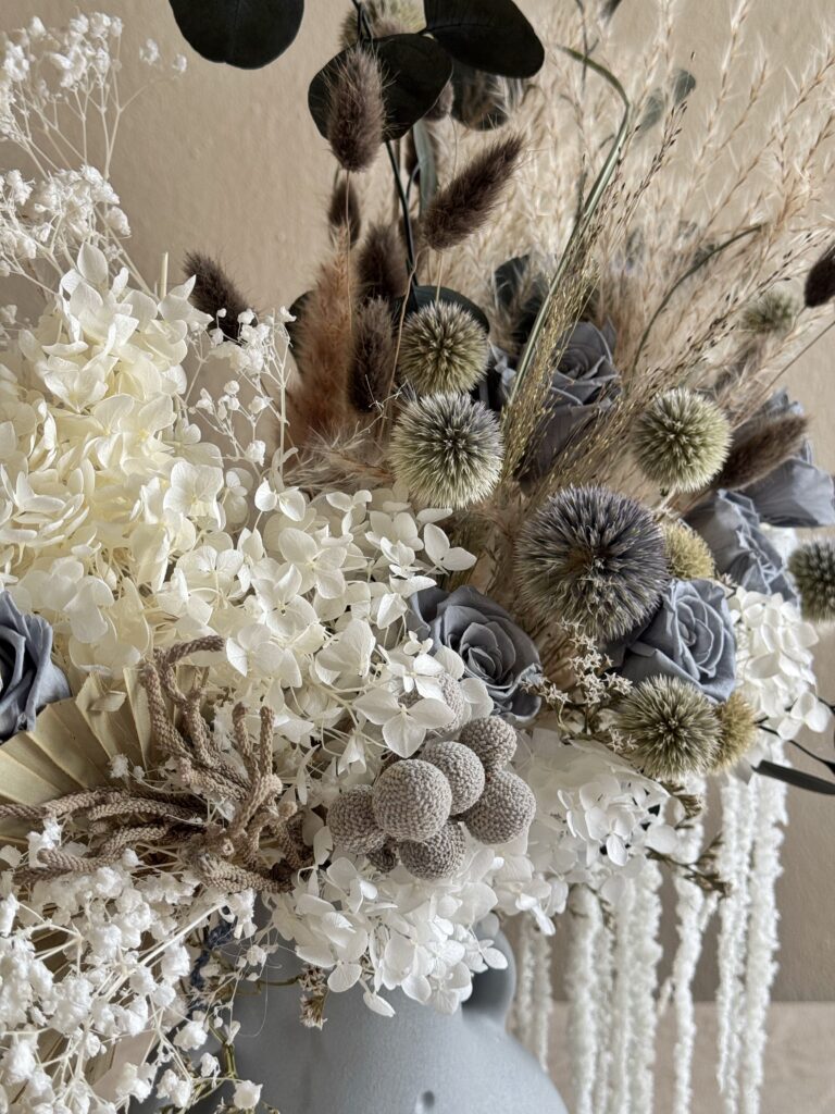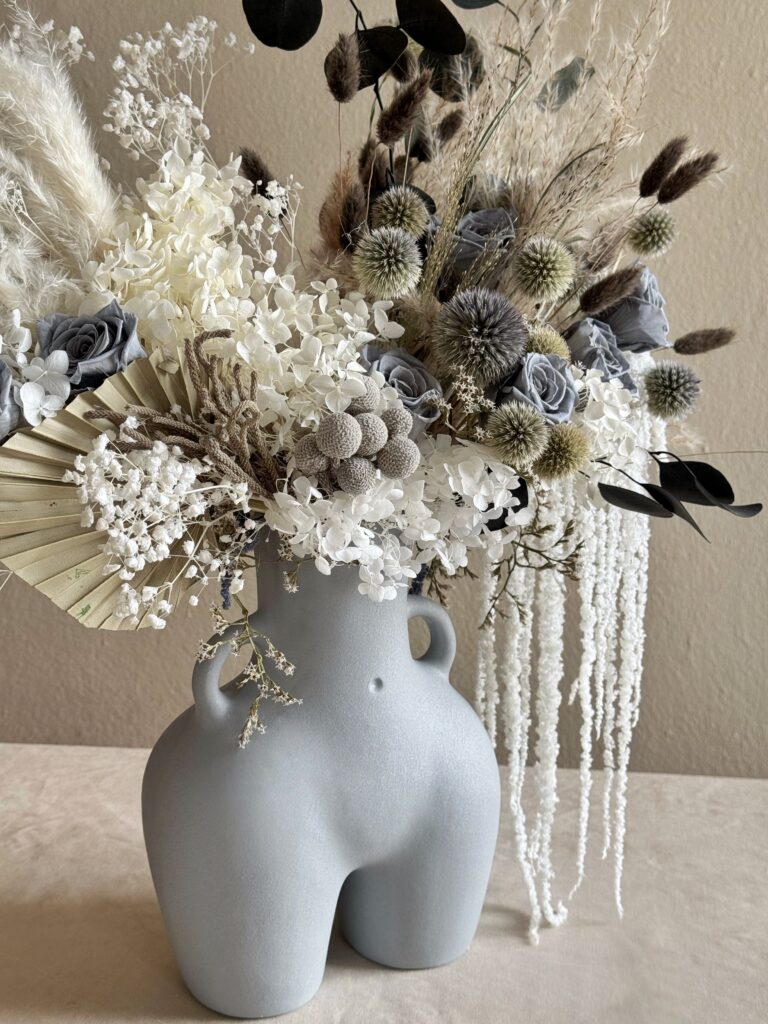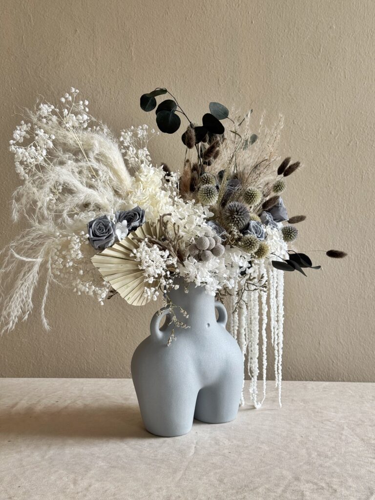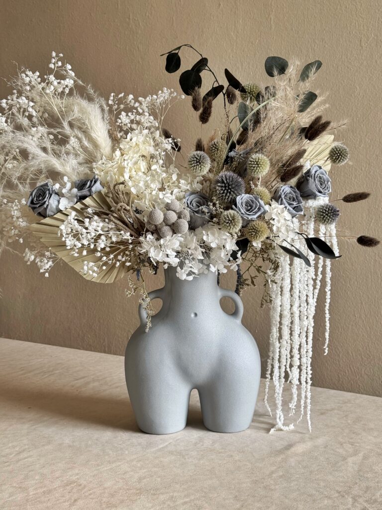 Букет «Архетип краси» – це вишукана композиція, яка вносить стиль і елегантність у будь-який інтер’єр. Шляхетні відтінки бежевого, білого та сірого створюють ефект умиротворення, підкреслений текстурою сухоцвітів і стабілізованих квітів. Керамічна ваза «Lola» робить композицію справжнім артоб’єктом. Підходить як для подарунка, так і для декору будинку, салону або фотозони.