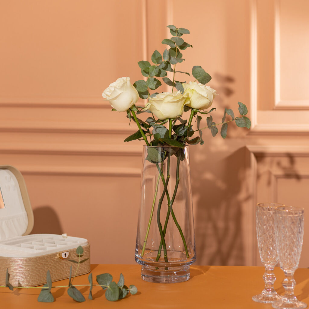 Скляна декоративна ваза з широким горлом виготовлена з прозорого скла високої якості. Вона має елегантну форму з плавними лініями, що дає змогу створювати стильні квіткові композиції або використовувати її як самостійний декоративний елемент. Висота вази становить 30 см, діаметр на верхньому краї – 8.5 см, що забезпечує зручність у розміщенні квітів різних розмірів. Основні характеристики: Матеріал: скло; Об’єм: 2.6 л; Діаметр: загальний – 10 см, верхній – 8.5 см, нижній – 10.5 см; Висота: 30 см; Глибина: 28 см. Широке горло вази дає змогу вільно розміщувати гілки, великі квіткові композиції або навіть декоративні елементи, як-от каміння чи водорості, що підкреслює її універсальність. Прозоре скло дає змогу чітко побачити внутрішній вміст і надає вазі легкості та елегантності. Для догляду за вазою рекомендується використовувати м’які мийні засоби та уникати абразивних матеріалів, щоб зберегти її без пошкоджень. Очищення вручну допоможе зберегти чистоту і первісний вигляд.