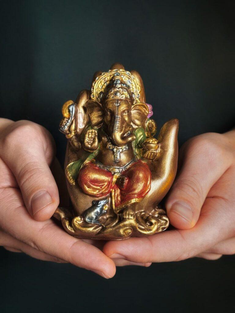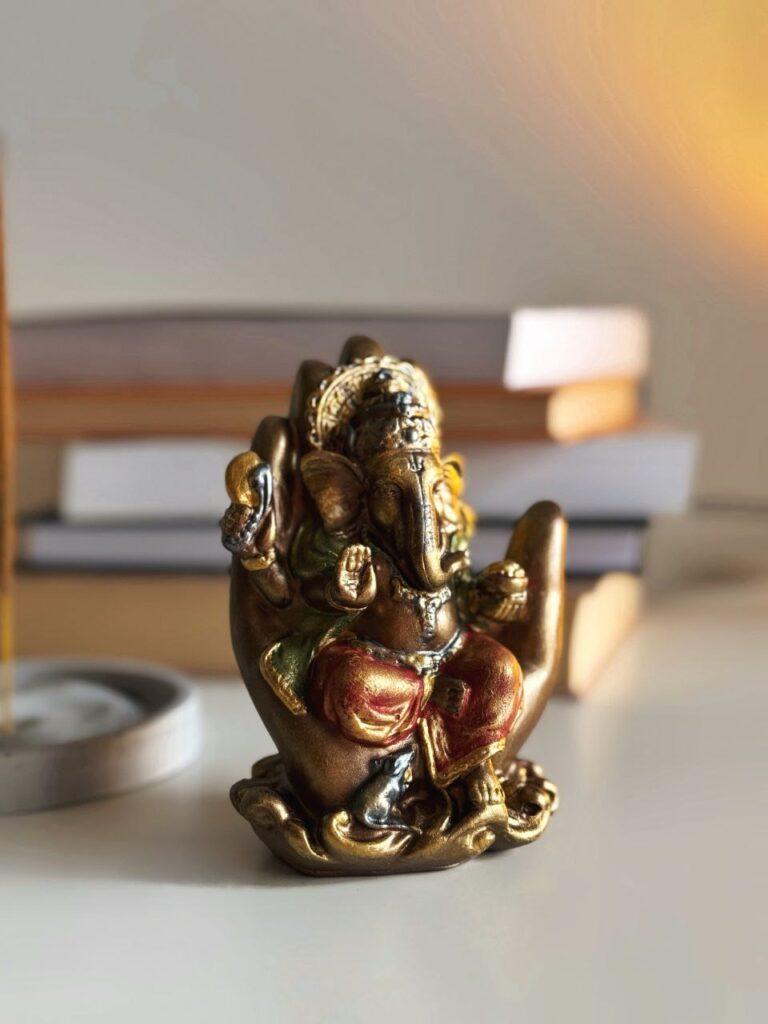 Ця унікальна статуетка зображає Ганешу — бога мудрості та добробуту, що сидить у благословляючій руці. Кожна деталь виконана з любов’ю вручну та ретельно розписана, що надає виробу особливої чарівності та значущості. Завдяки бронзовому покриттю, статуетка стане елегантною прикрасою інтер’єру та символом добробуту у вашому домі. Ідеально підходить як для власного використання, так і як подарунок на особливі події.