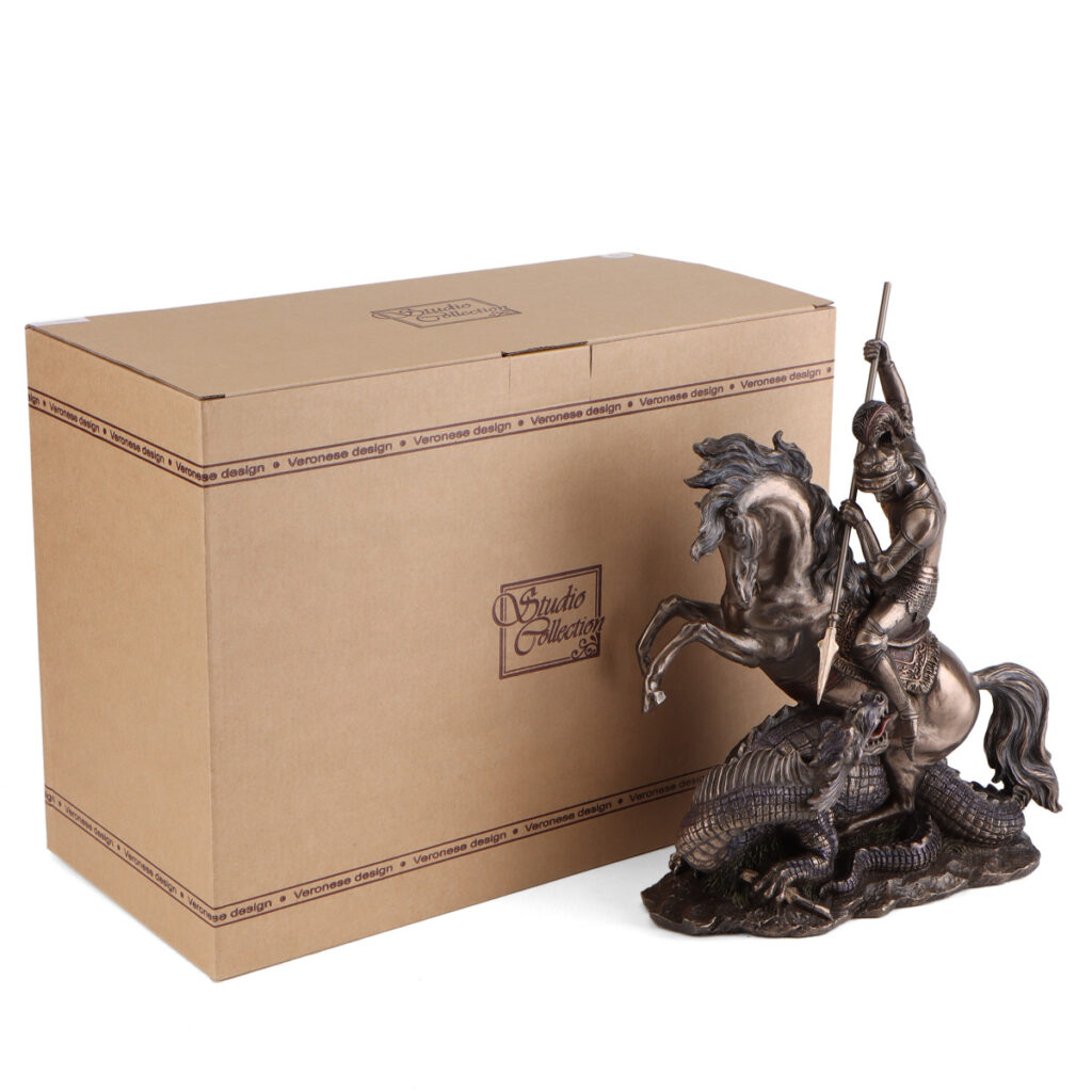 Статуетка «Георгій Побідоносець» уособлює собою одного з найбільш шанованих в християнстві великомучеників.Це покровитель всіх воїнів, заступник рідних.Особливості:Виріб виготовлено з полистоуна (штучний камінь), покрито напиленням з бронзи і упаковано в подарунковуЗавдяки надійній упаковці, виготовленій з пінопласту з заглибленнями для самих маленьких деталей, Ви можетеVERONESE
