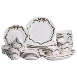 Порцеляновий столовий сервіз ROYAL з 32 предметів на 6 персон зручне та стильне рішення як для повсякденних обідів, так і для святкового сервірування. Виготовлений із високоякісної порцеляни, він має гладку поверхню, стійку до подряпин і перепадів температур, а квітковий візерунок надає сучасного та елегантного вигляду. До комплекту входять тарілки різного діаметра, для подавання основних страв, закусок і десертів. Також у комплекті є дві овальні страви та чашки все необхідне для комфортного обіду або вечері. Порцеляна утримує тепло, не вбирає запахи та легко миється, що робить використання сервізу зручним і практичним. Основні характеристики столового сервізу з порцеляни: Кількість предметів: 32; Кількість осіб: 6; Матеріал: порцеляна; Діаметр тарілок: 26 см, 21 см, 17 см, 14.5 см; Діаметр чашок: 10 см; Об’єм глибоких тарілок: 500 мл; Об’єм чашок: 300 мл; Додатково: 2 сервірувальні страви (36×20 см); Призначення: для подавання основних страв, десертів і напоїв. Основні переваги сервізу Універсальність: підходить як для повсякденного використання, так і для святкових застіль. Довговічність: порцеляна це міцний і зносостійкий матеріал, який слугуватиме вам довгі роки. Естетичність: набір стане прикрасою вашого столу. Безпека: порцеляна не містить шкідливих речовин і безпечна для здоров’я. Легкість у догляді: набір можна мити в посудомийній машині. Цей порцеляновий сервіз стане практичним і елегантним доповненням будь-якого столу, що підходить як для повсякденних обідів, так і для святкових вечер. Він також чудово підходить як стильний і корисний подарунок.
