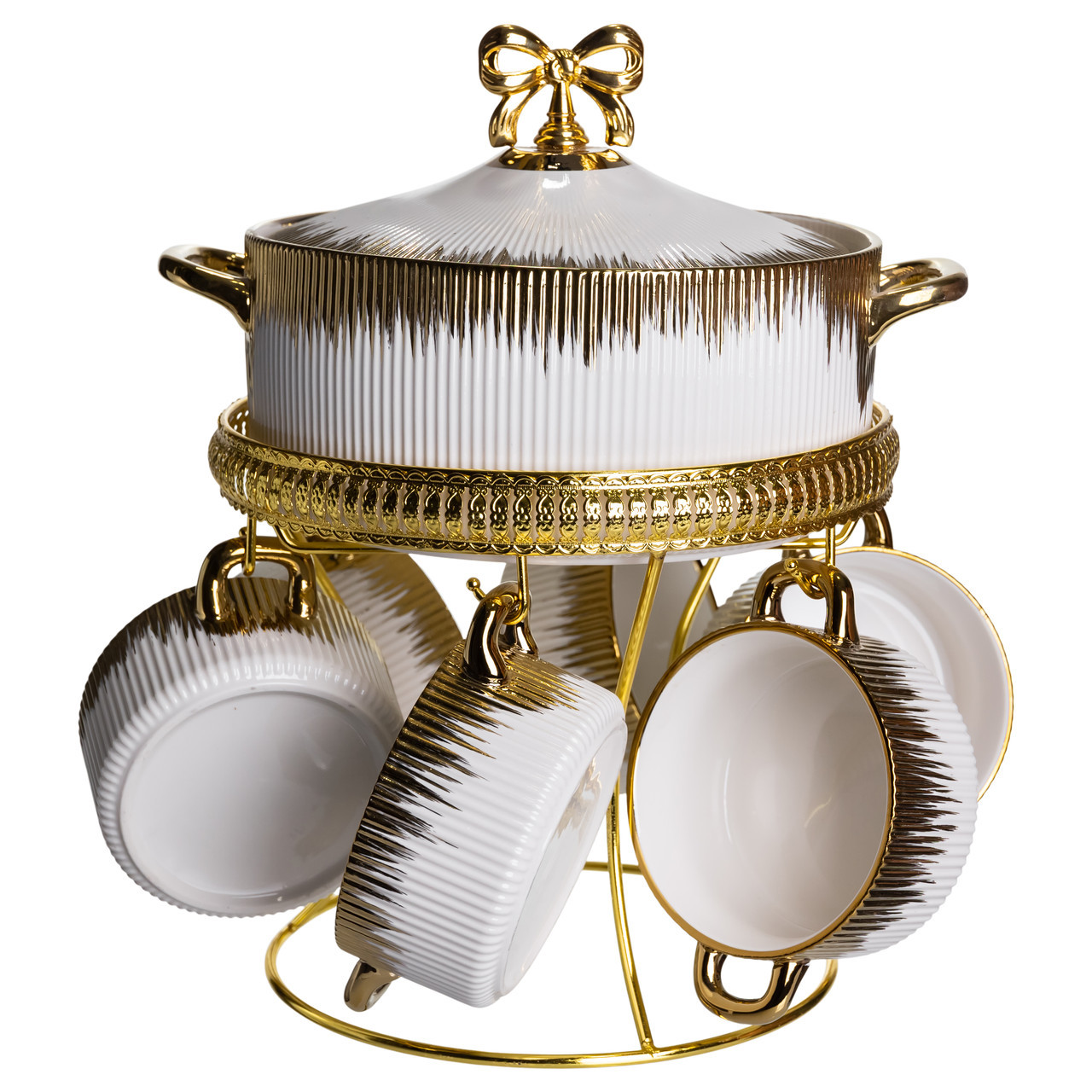 Суповий сервіз із високоякісної порцеляни стане прикрасою будь-якого столу та додасть сервіруванню нотку вишуканості. Елегантне поєднання білого кольору із золотими та чорними акцентами робить набір особливо ошатним і сучасним. До комплекту входить супниця з кришкою та шість супових тарілок, на міцній металевій підставці із золотим покриттям. Завдяки зручній формі та продуманому дизайну сервіз не тільки красивий, але й практичний у використанні. Основні характеристики супового сервізу: Матеріал: порцеляна + метал; Розмір: 25×25×33 см; Обсяг супиці: 2 літри; Об’єм тарілок: 400 мл; Діаметр супниці: 22 см. Діаметр тарілок: 11см. Такий набір прекрасно підійде для сімейних обідів, святкових вечер або урочистих заходів. Він стане чудовим подарунком на весілля, новосілля або ювілей, підкреслюючи смак і увагу до деталей господарів будинку.