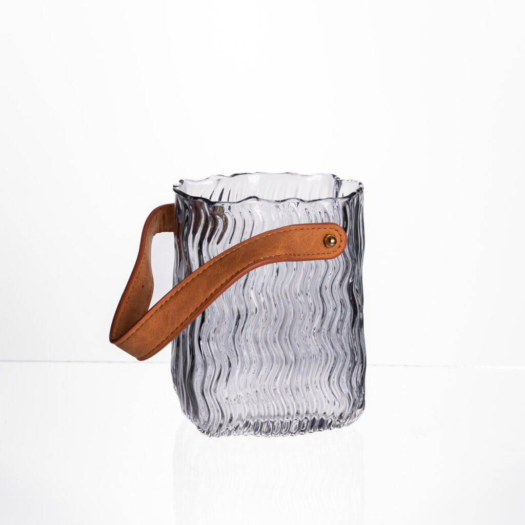 Скляна ваза з хвилястим візерунком і стильною ручкою зі шкірозамінника. Оригінальний дизайн дозволяє використовувати її як вазу для квітів, свічник або декоративний контейнер. Прозоре скло з фактурними стінками гарно заломлює світло, а ремінець на металевому кріпленні додає акценту. Основні характеристики скляної вази-сумочки для квітів: Матеріал: скло, штучна шкіра; Розмір: 12×8.5×16см; Глибина: 14 см; Об’єм: 800 мл. Переваги декоративної вази з ручкою: Ваза підходить для різних типів кольорів, а також для сухоцвітів; Ваза виготовлена з високоякісного скла, що гарантує її міцність та довговічність; Підходить для сучасних, мінімалістичних та скандинавських інтер’єрів Ця ваза легко впишеться у вітальню, спальню чи офіс, підкреслить індивідуальність простору та стане оригінальним подарунком для поціновувачів стильних аксесуарів.